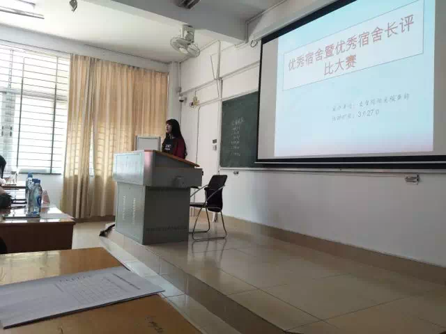 随后,评比活动正式开始,六个参与评比活动的宿舍长依次上场发言,并进行约八分钟的PPT展示。梅园20号309的宿舍长刘芳美同学从成员介绍、学习情况、生活情况、宿舍关系、未来寄语五个方面全面具体的展示了309的风采与风貌。随后莲园7号208宿舍长唐锡雯同学和407宿舍长王银娣同学分别以精美的PPT展示了女生宿舍丰富多彩的日常活动、优秀的学习成绩与和谐友爱的宿舍关系。