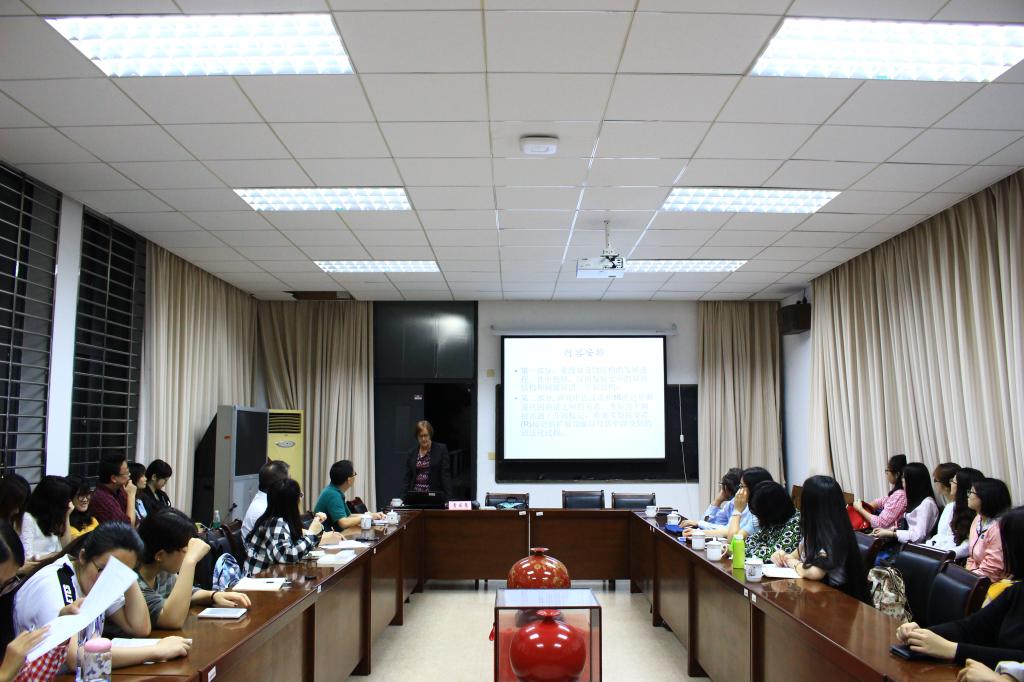 讲座上,曹茜蕾为大家介绍了双及物动词的发展历程,并结合例子举出六种双及物句型。随后结合《荔镜记》的内容展示了早期闽南语,并说明闽南语的研究意义。接着,曹教授还介绍了“乞”字句、“度”字句、“还”字句、“与”字句、“给”字句的句法结构,以及早期闽南话中四个给予动词语法化的不同阶段。讲座尾声,王建设、胡斌彬、吕晓玲等与曹茜蕾交流看法并为曹教授的研究提出了参考意见。