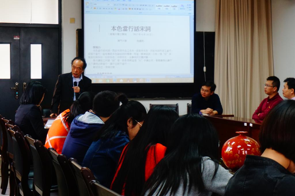 首先,施教授用浅显的例子引出本次讲座的主题,并表明“评价词的标准除了功利标准、审美标准,还应该有一个标准,那就是本色当行。”的观点。随后,他从四个主要方面为大家讲解了“本色当行”的深层含义:一、本色与本色论;二、宋人的言说和今人的体验:三、本色与非本色的辨别方法;四、门径和模式(即创作方式)。近两个小时的讲座,施议对教授坚持站着面对大家,讲到激动的地方还会离开座位,手舞足蹈。78岁高龄的他,在自己热爱的宋词面前,像个年轻小伙子一般滔滔不绝,充满朝气。“这是我第三次来华大suncitygroup太阳集团开讲座了…五年过去了,我又来了。”施教授如是说,语气中满含着期待和欣喜。最终讲座在热烈的掌声中结束,此次讲座让在场师生接触到许多新颖的看法,对宋词也有了更深层的了解。