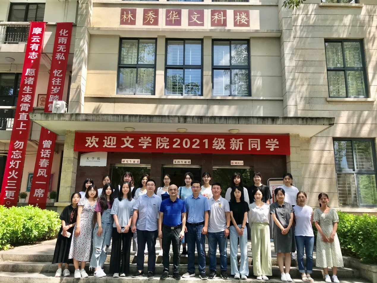 研究生新生与师长们亲切交流后,座谈会接近尾声。与会人员在林秀华文科大楼门厅前合影留念。