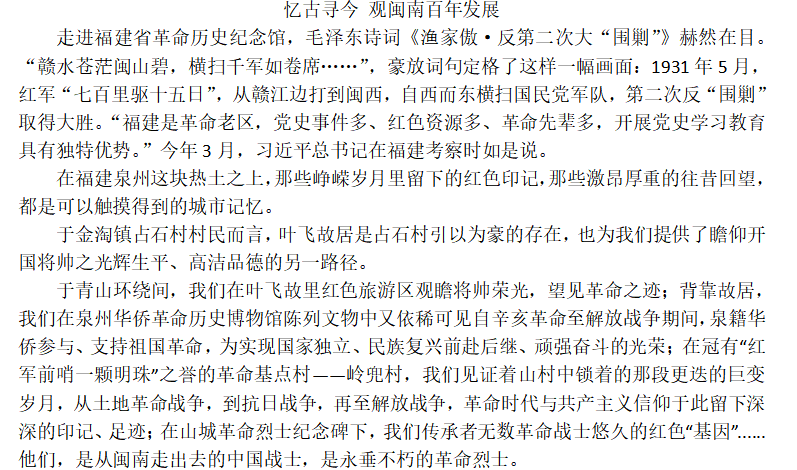 在优秀征文《探闽南文化,叙千年风雅》中,张燕同学从闽南精神、非遗风采、闽南百年发展入手,诉说泉南古国那悠久厚重的历史底蕴和精神特质,书写属于闽南人的拼搏故事,在忆古寻今中,探索百年征程峥嵘岁月里烙印的红色印记。