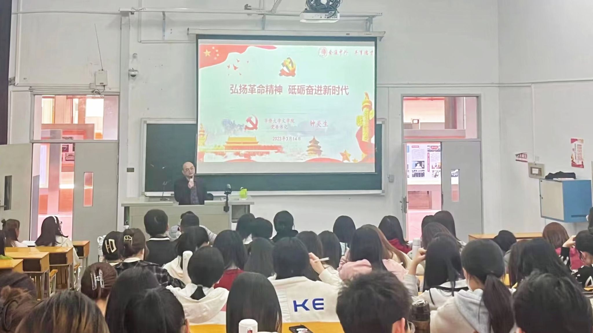 党课上,钟炎生书记首先带领同学们回顾了党的光辉历史和党团结带领中国人民所取得的伟大成就。他指出,中国共产党在长期革命斗争实践中形成发展的革命精神,是克敌制胜的力量源泉和有效法宝,是我们党立党、兴党、强党的宝贵精神财富。随后,他以党员前辈感人事迹举例,并结合自身成长经历,深刻阐释了革命精神的内涵,正因为一代又一代中国共产党人的顽强拼搏、不懈奋斗,我们的革命精神才具有如此深刻的现实性和历史鲜活性;只有具有伟大精神的政党,才能领导人民赢得伟大斗争、开创伟大事业。