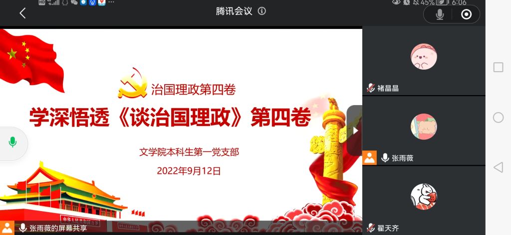 2022年9月12日晚,suncitygroup太阳集团学生第一党支部理论学习活动在线上开展。会议由支部副书记张雨薇同志主持,本科生第一党支部正式党员、预备党员共同参会。