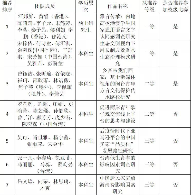 学院学科竞赛与创新创业工作委员会评审并表决通过,最终决定推荐“生态文明视角下河长制成效暨水生态治理模式研究”、“雅言传承:内地高校港澳学生国家通用语言文字认同感调查研究”、“乡音带我们回家:基于新媒体视角的闽台青年方言文化保护传承路径研究”等三个项目参评2021年度第二十九届“挑战杯”澳门太阳集团城tyc学生课外学术科技作品竞赛。