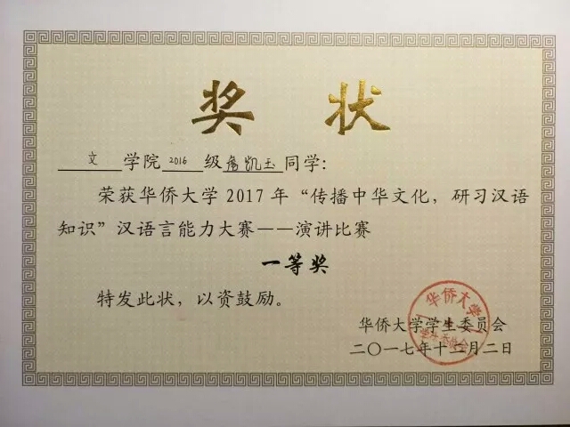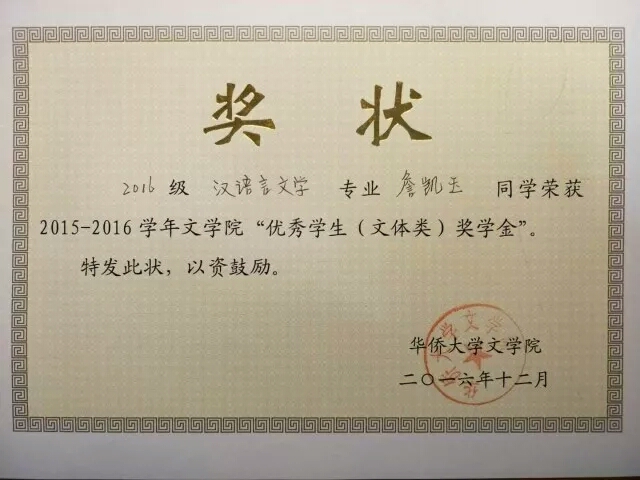 詹凯玉同学热爱中国,热爱学校,热爱班级,品学兼优,积极参与校内外各项体育竞赛和侨生活动,主持并参与学院大型文艺汇演,获得各种奖项和好评。詹凯玉同学热情活泼、落落大方的形象也感染着身边的同学,为同学们带来了很多快乐。